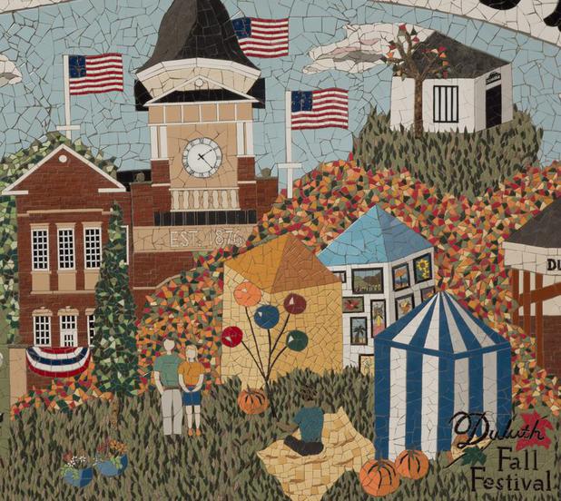 Commissioned in 2016, this 100 square foot (25 ft. wide by 5 ft. high) historic mosaic of Duluth, Ga. was requested by the Duluth Fall Festival Committee. It is displayed on the side of a local restaurant in downtown Duluth. Materials used were porcelain tile, stained glass, gravel and brick. The mosaic was created in panels on Hardy Backer as a substrate and installed (on time and within budget) using thinset to adhere to the side of the restaurant. Total cost: $25,000.to add text.